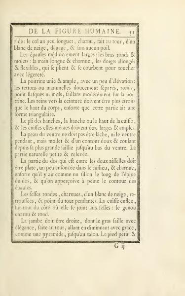 The text outlines the ideal characteristics of the human figure, focusing on the neck, shoulders, chest, waist, hips, back, buttocks, legs, and feet. Each body part is described in terms of shape, size, and texture, with an emphasis on symmetry, firmness, and elegance. The aim is to capture an idealized form that balances proportion and grace.