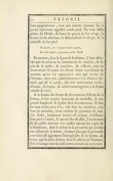 In short, in the figure of the woman, it is necessary to observe that her features or the contours of her muscles, her way of positioning herself, walking, sitting, all her movements and actions should be represented in a way that nothing masculine is perceived; but that, according to her primitive element, which is the circle, she is entirely round, delicate, and supple, and entirely opposite to a robust and virile form.