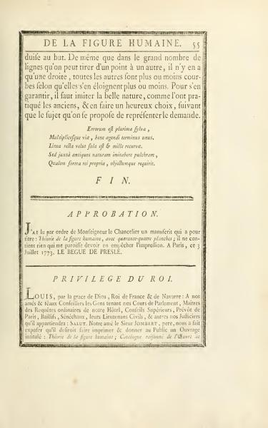 I have read by order of the Chancellor a manuscript titled: Theory of the Human Figure, with forty-four plates; it contains nothing that seems to me to prevent its printing. In Paris, this 3rd of July 1773. LE BEGUE DE PRESLE.