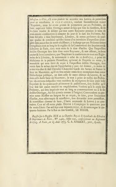 Registered on the Register XIX of the Royal Chamber & Syndicates of Booksellers & Printers of Paris, No. 2465, folio 120, in accordance with the Regulation of 1723. In Paris, this 13th of August 1773: C. A. JOMBERT, father, Syndic.