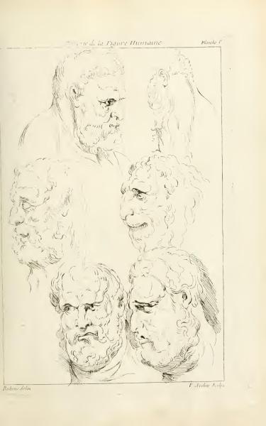 This page is titled 'Collection of the Human Figure, Plate I.' It indicates that the sketches were drawn by Rubens and engraved by P. Aveline. The artwork focuses on studies of the human head and facial expressions.