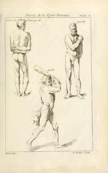This page from "Theory of the Human Figure" features drawings related to human anatomy, likely influenced by Leonardo da Vinci's work. The engravings were drawn by Rubens and engraved by Aveline. It highlights both static and dynamic representations of the human form.