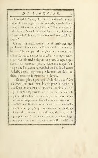 We cannot conclude this Notice better than by the following excerpt from the Preface placed at the head of the school of Urania, by Mr. de Querlon, a highly esteemed and well-known author through the excellent periodical works with which he has long enriched the republic of letters: this excerpt obviously proves that the work given to the Public today has been known and desired for a long time by amateurs and artists, as previously noted.