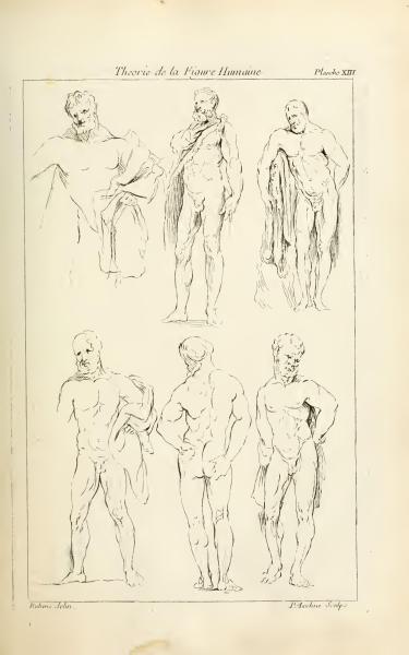 The page is titled "Theory of the Human Figure" and is Plate XIII from a series. It indicates that Rubens created the designs and P. Aveline did the engravings. The text serves as a caption for the sketches displayed.