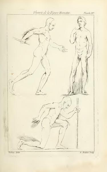 The page is titled "Theory of the Human Figure, Plate XV," and credits both the artist Rubens for the drawings and P. Aveline for the engravings. The drawings depict various human poses and are part of a larger work on figure drawing principles.