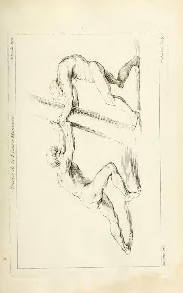 This page contains an illustration from "Theory of the Human Figure" by Rubens, showing two men climbing. It is Plate XIX, engraved by P. Aveline and based on Rubens' designs. The artwork demonstrates human anatomy and motion.