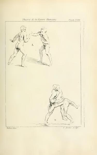 The image is from "Theory of the Human Figure" and features engravings by P. Aveline based on Rubens' designs. The captions indicate it is Plate 23 of the work. The focus is on human figures in motion, showcasing different poses.