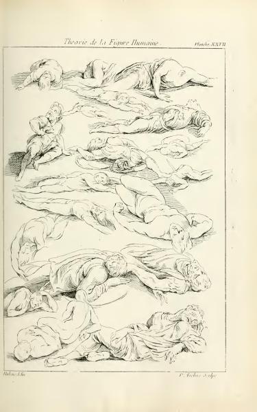 The image features a page titled "Theory of the Human Figure, Plate XXVII." It is part of a work dedicated to the study of human anatomy and form, illustrated by Pierre Aveline after designs by Peter Paul Rubens. This page specifically includes a series of sketches showing reclining human figures in various poses, emphasizing the artist's exploration of anatomy in resting positions.