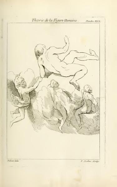 The text describes a section of Peter Paul Rubens' work titled "Theory of the Human Figure" and refers to an engraving (Plate 30) designed by Rubens and engraved by Pierre Aveline. It is a visual representation related to his study of the human figure in art.