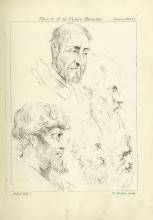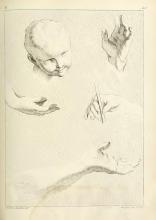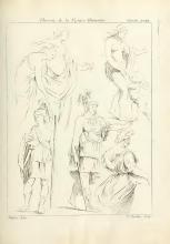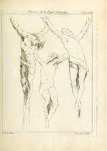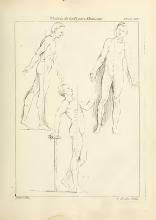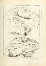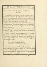The text discusses various aspects depicted in several plates, highlighting how they demonstrate artistic principles related to body lines, particularly in deceased figures and angels. A specific work by Rubens is mentioned, modeled after an ancient bas-relief. Additionally, the text elaborates on different types of ancient statues, categorizing them by size and their representation of natural proportions. |