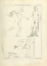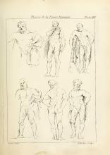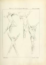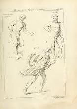 The text discusses different types of human body movements, including natural, mental, physical, mixed, and local movements. It mentions various plates showing figures in different postures and attitudes, with some illustrating ancient statues. The text explains the characteristics and implications of each type of movement, noting the irrelevance of some to artists. |