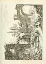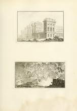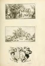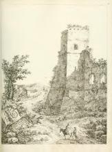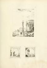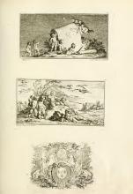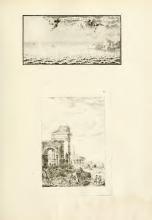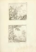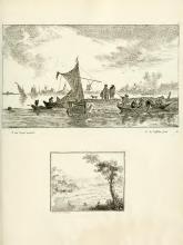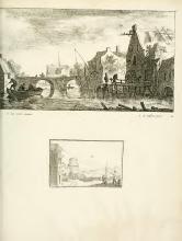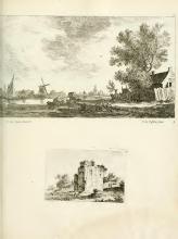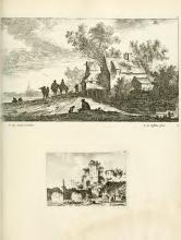 The inscriptions refer to the creators and executors of the artworks. Van Goyen conceptualized the top pastoral scene, while de Visscher engraved it. The lower image is titled "Ancient Tomb," illustrating a classical architectural structure. |