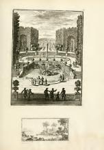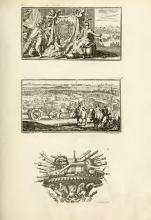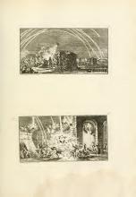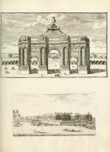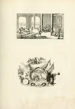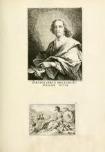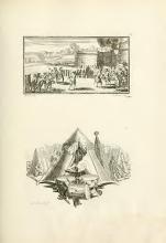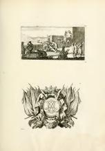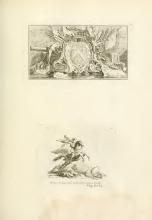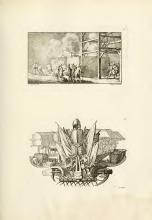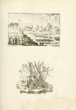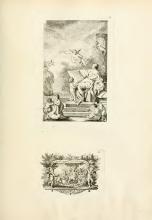 The page features two engravings: a military landscape and a decorative floral illustration. These images are likely part of a work by Peter Paul Rubens, showcasing his interest in both narrative scenes and detailed ornamental designs. The engravings highlight the artistic and engraving techniques of the 18th century. |