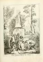 The engraving depicts Tobias overseeing the burial of dead individuals. It suggests a biblical or historical narrative, with a focus on the act of burying the deceased. |