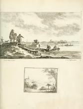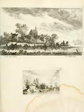 The image features two artworks. The first is a landscape by Johan van Goyen, elegantly crafted and engraved by Johann de Visscher, showcasing charming natural scenery. The second is a sequence of landscapes invented and engraved by J. Aveline. |