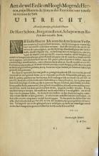 The text is a formal address to the Lords of Utrecht, showing gratitude and humility. It explains that the author wishes to dedicate a small work to them, acknowledging their support and expressing hope for future opportunities. The author also focuses on providing education and art to the common people, especially children, without much cost. |