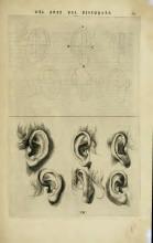The page is titled "The Art of Drawing" and includes text labeling focal points in ear illustrations. It is part of an instructional work on art techniques, specifically focusing on drawing the human ear. |