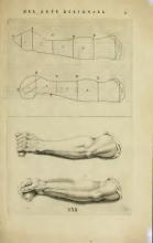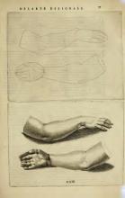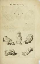 The text includes a heading "Of the Art of Drawing" and letters labeling various images. The images likely serve as instructional aids in a historical art book, demonstrating techniques for drawing hands. |