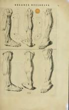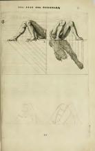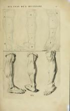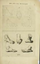 The text translates to "On the Art of Drawing," and the page is part of a book that demonstrates methods for drawing the human body, specifically focusing on feet in this instance. The images show both realistic and geometric illustrations to aid artists in understanding form and proportion. |