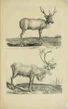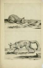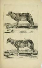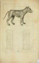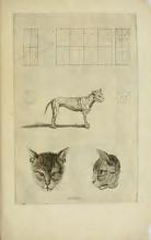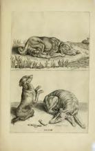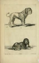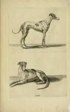 The page displays two detailed engravings of dogs in natural poses. It represents the number 34 in Roman numerals. These illustrations are part of a historic book featuring artistic techniques. |