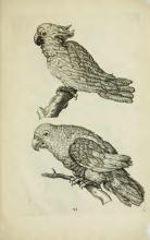The text merely indicates 'VI,' suggesting a plate number. The focus of the page is on the detailed images of two parrots. It is part of a larger work on drawing in 'The First Part of the Light of Painting and Drawing' published in 1670. |