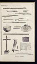 The page features a collection of labeled figures illustrating various drawing instruments used in the 18th century. Each figure represents a specific tool, ranging from brushes to equipment for drafting and measuring. The image is aimed at educating readers about the different tools used in artistic practices. |