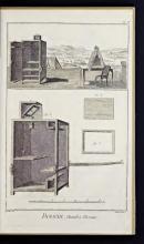 The text titled "Drawing, Camera Obscura" accompanies detailed illustrations of various components of a camera obscura. It provides insight into the construction and functioning of early image projection devices used in art and drawing during the 18th century. |