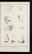 The image is a plate from a book on drawing, showing numbered sketches of eyes and noses. It serves as a guide for artists to understand the anatomy and proportional details of these features. |