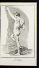 The text is a title in French, translating to 'Drawing, Academic Figure.' This indicates it's an academic illustration of a nude figure from a book published in 1777 by Charles Nicolas Cochin. |