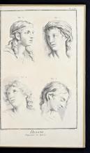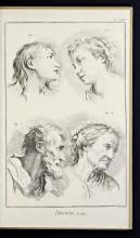 The image contains sketches illustrating different facial expressions to demonstrate the expression of passions in art. Each of the four figures provides an example of how emotions can be represented in a drawing. The title suggests a focus on the artistic depiction of human emotions. |