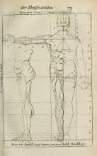 The text explains the detailed workings of various muscles, such as the biceps and triceps, and their roles in different arm movements and positions. It emphasizes how muscles like the Brachieus, Longus, and Brevis should be depicted to show strength and accuracy in art. The descriptions also include muscles associated with lifting and twisting actions, and their relevance to stable figure representation. |