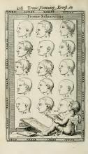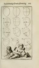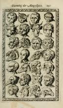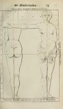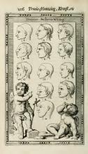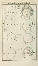 The text is a table of contents from a historic book on art and human form, providing headings and page numbers. Topics include the study of human anatomy, aesthetics, and certain societal views on beauty and behavior. A variety of anatomical and artistic concepts are introduced, such as face structure, hair styles, and cultural perceptions. |