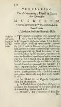 The text explains the naming, function, and location of visible facial muscles, focusing on the head and neck. It details the role of the temporalis muscle in chewing and its physical characteristics, including its helper known as 'Ore Latitans'. Additionally, it describes muscles responsible for closing the upper eyelid and those related to the cheek and upper lip. |