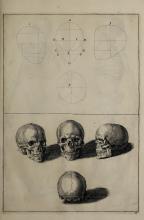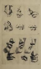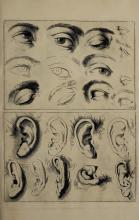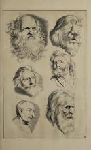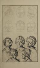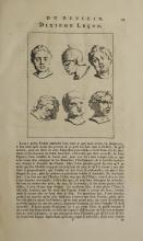 The image contains instructional illustrations for drawing human heads, showing different perspectives and guides for facial features. It highlights the use of geometric lines for proportions. Part of "The Principles of Drawing" by Gerard de Lairesse. |