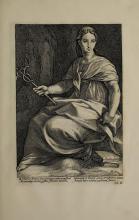 The text is a Latin excerpt from the Gospel of Luke, often referred to as the "Nunc dimittis," expressing a servant's peaceful departure in accordance with God's word. It references the work of an artist, credited as Bloemaert. The scene likely describes a religious or biblical event. |